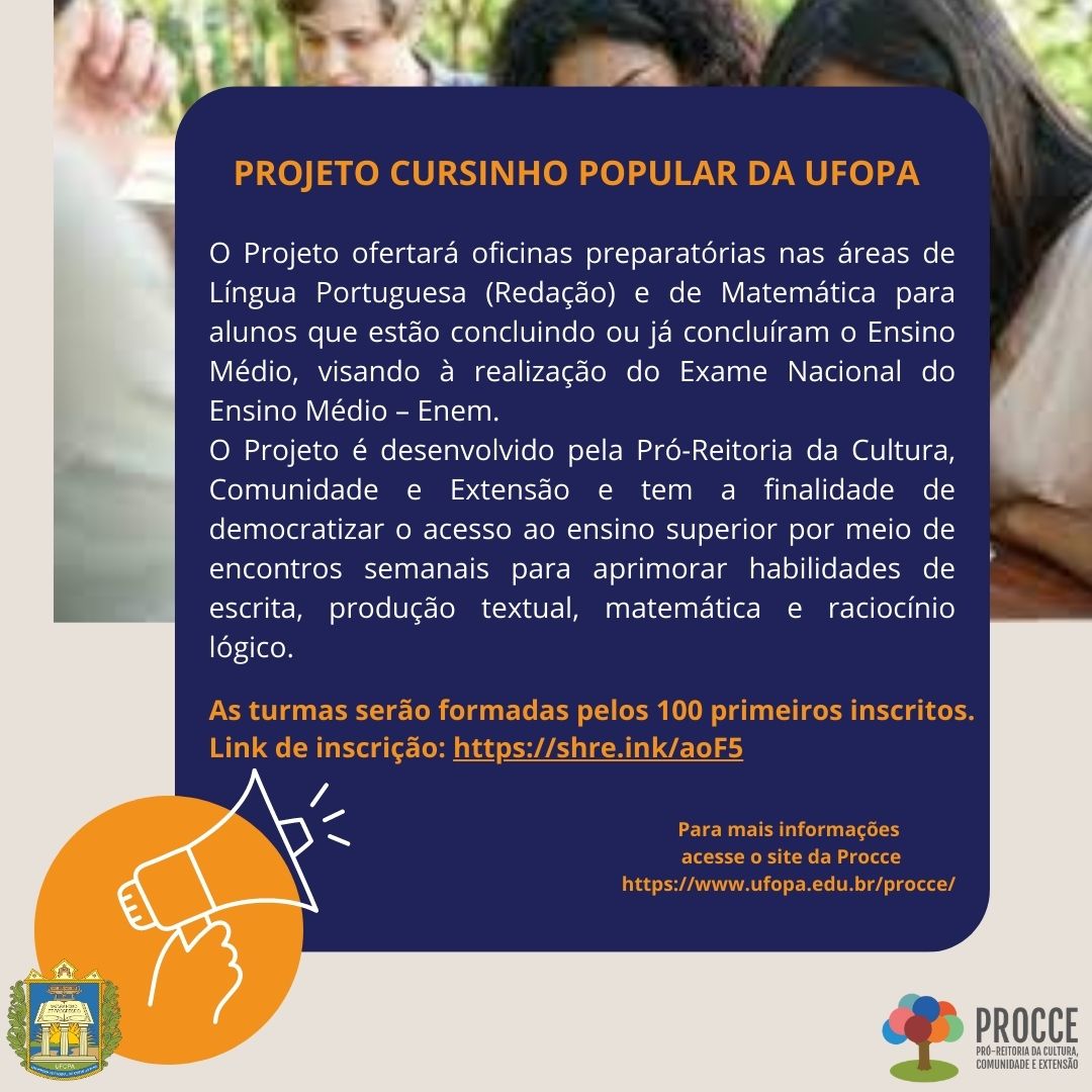 A Universidade Federal do Oeste do Pará está com inscrições abertas para o Cursinho Popular da Ufopa, projeto que ofertará oficinas preparatórias nas áreas de Língua Portuguesa (Redação) e de Matemática para alunos de baixa renda que estão concluindo ou já concluíram o Ensino Médio, visando à realização do Exame Nacional do Ensino Médio – Enem.